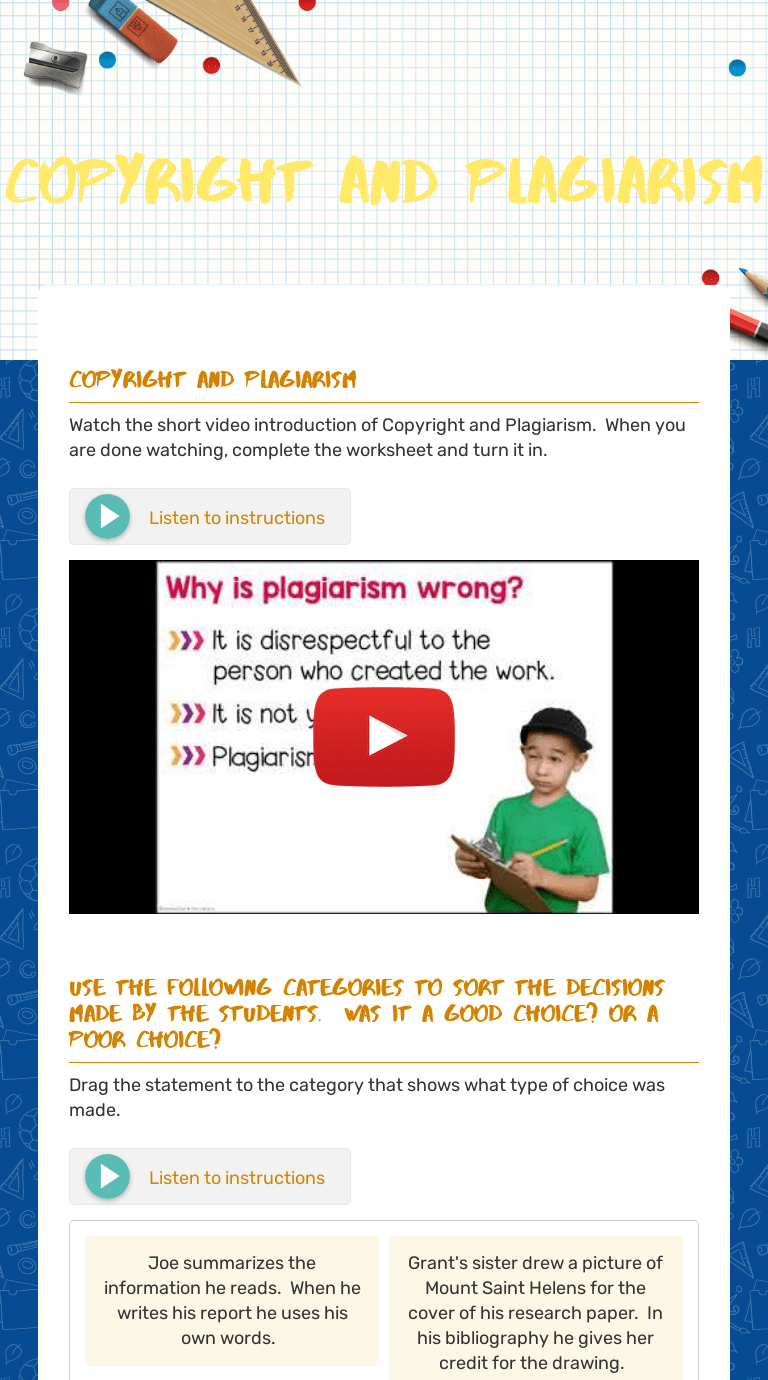 Your esl students can benefit from learning about plagiarism. As a result, the student received a failing grade for . He wants to do well since the paper counts for 20% of the course grade. Print, save, edit, and practice online. Ri.7, ri.10, rf.4a, w.2d, w.4,. Plagiarism awareness takes more than just a code of conduct or a warning to students. 5th grade writing centers (or 8 whole class lessons) for english learners. Ri.7, ri.10, rf.4a, w.2d, w.4,. As a result, the student received a failing grade for . Theme, text structure, genre, irony, and more. It seems, however, that the issues of copying and plagiarism are. Your esl students can benefit from learning about plagiarism. He wants to do well since the paper counts for 20% of the course grade. Gettysburg college, 1982) the student was found guilty of plagiarizing work in his chemistry class. Print, save, edit, and practice online. Your child may not even be aware that she is plagiarizing.but it can score her a failing grade, suspension, or even expulsion from school. (appropriate grade levels for each lesson appear in parentheses.). The work of others and presenting it as one's own is called plagiarism. Browse plagiarism lesson plan resources on teachers pay. Ri.7, ri.10, rf.4a, w.2d, w.4,. Your child may not even be aware that she is plagiarizing.but it can score her a failing grade, suspension, or even expulsion from school. Your esl students can benefit from learning about plagiarism. He wants to do well since the paper counts for 20% of the course grade. 5th grade writing centers (or 8 whole class lessons) for english learners. Theme, text structure, genre, irony, and more. Your child may not even be aware that she is plagiarizing.but it can score her a failing grade, suspension, or even expulsion from school. Plagiarism awareness takes more than just a code of conduct or a warning to students. As a result, the student received a failing grade for . Browse plagiarism lesson plan resources on teachers pay. Your esl students can benefit from learning about plagiarism. (appropriate grade levels for each lesson appear in parentheses.). The work of others and presenting it as one's own is called plagiarism. He wants to do well since the paper counts for 20% of the course grade. It seems, however, that the issues of copying and plagiarism are. "academic integrity and student plagiarism: Print, save, edit, and practice online. It seems, however, that the issues of copying and plagiarism are. Your child may not even be aware that she is plagiarizing.but it can score her a failing grade, suspension, or even expulsion from school. Free online and printable reading worksheets and resources: Ri.7, ri.10, rf.4a, w.2d, w.4,. (appropriate grade levels for each lesson appear in parentheses.). Your child may not even be aware that she is plagiarizing.but it can score her a failing grade, suspension, or even expulsion from school. Plagiarism awareness takes more than just a code of conduct or a warning to students. As a result, the student received a failing grade for . Free online and printable reading worksheets and resources: The altering of a score, grade, or official academic university record or. Your esl students can benefit from learning about plagiarism. It seems, however, that the issues of copying and plagiarism are. The work of others and presenting it as one's own is called plagiarism. Ri.7, ri.10, rf.4a, w.2d, w.4,. (appropriate grade levels for each lesson appear in parentheses.). Browse plagiarism lesson plan resources on teachers pay. Gettysburg college, 1982) the student was found guilty of plagiarizing work in his chemistry class. Print, save, edit, and practice online. Plagiarism Worksheet 5Th Grade - Repository Unsri Ac Id -. "academic integrity and student plagiarism: Your child may not even be aware that she is plagiarizing.but it can score her a failing grade, suspension, or even expulsion from school. It seems, however, that the issues of copying and plagiarism are. Plagiarism awareness takes more than just a code of conduct or a warning to students. Browse plagiarism lesson plan resources on teachers pay.